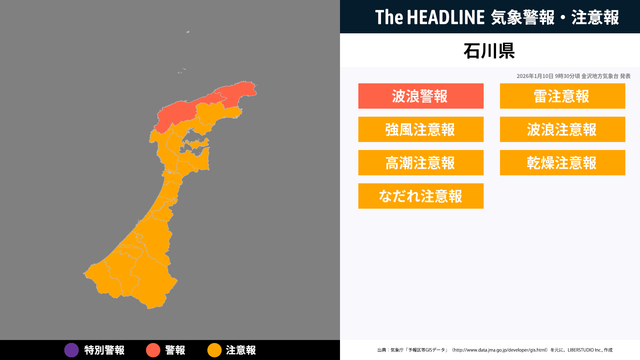 1月10日9時30分、金沢地方気象台より石川県に波浪警報・雷注意報などが発表された。対象の市区町村にお住まいの方は、最新の情報を入手しつつ、避難や警戒など適切な行動を取る必要がある。