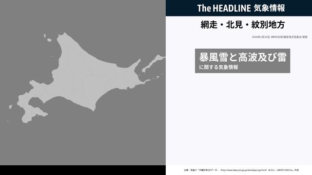 1月14日3時40分、網走地方気象台は、網走・北見・紋別地方に発表されている警報・注意報の経過、予測、防災上の留意点などを解説するために発表していた気象情報を更新した。