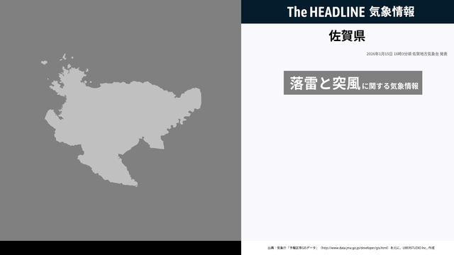1月15日16時3分、佐賀地方気象台は、佐賀県に発表されている警報・注意報の経過、予測、防災上の留意点などを解説するために発表していた気象情報を更新した。