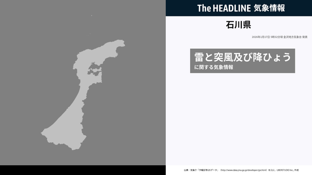 1月17日5時32分、金沢地方気象台は、石川県に発表されている警報・注意報の経過、予測、防災上の留意点などを解説するために発表していた気象情報を更新した。