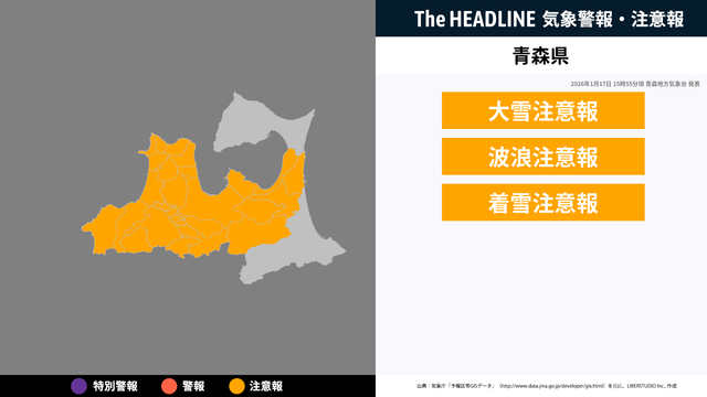 1月17日15時55分、青森地方気象台より青森県に大雪注意報・波浪注意報などが発表された。