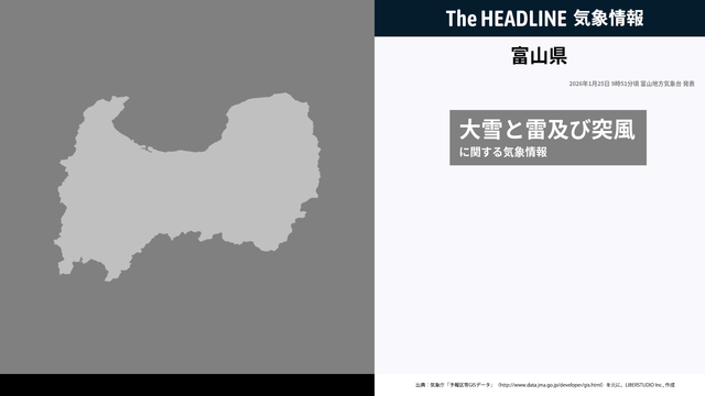 1月25日9時51分、富山地方気象台は、富山県に発表されている警報・注意報の経過、予測、防災上の留意点などを解説するために発表していた気象情報を更新した。