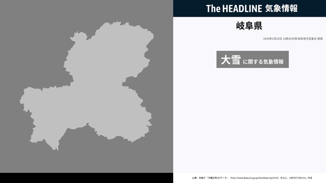 1月25日12時20分、岐阜地方気象台は、岐阜県に発表されている警報・注意報の経過、予測、防災上の留意点などを解説するために発表していた気象情報を更新した。