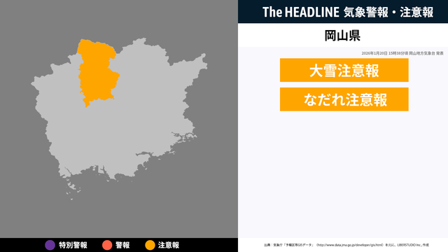 1月20日15時38分頃、岡山県に大雪注意報・なだれ注意報が発表