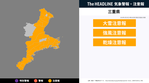 1月25日5時56分、津地方気象台は、三重県に発表されている警報・注意報の経過、予測、防災上の留意点などを解説するために発表していた気象情報を更新した。