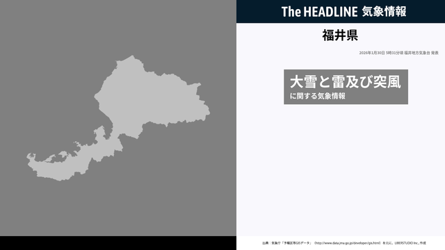 1月30日5時31分、福井地方気象台は、福井県に発表されている警報・注意報の経過、予測、防災上の留意点などを解説するために発表していた気象情報を更新した。