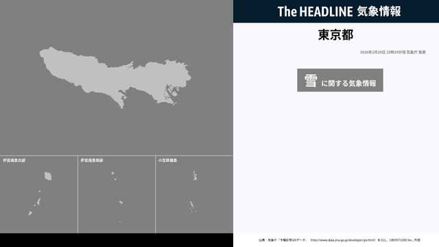 1月29日22時24分、気象庁は、東京都に発表されている警報・注意報の経過、予測、防災上の留意点などを解説するために発表していた気象情報を更新した。