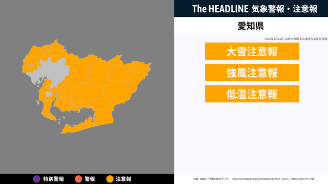 1月29日15時14分頃、愛知県に大雪注意報・強風注意報などが発表