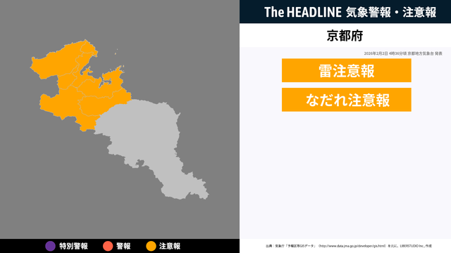 2月2日4時36分頃、京都府に雷注意報・なだれ注意報が発表