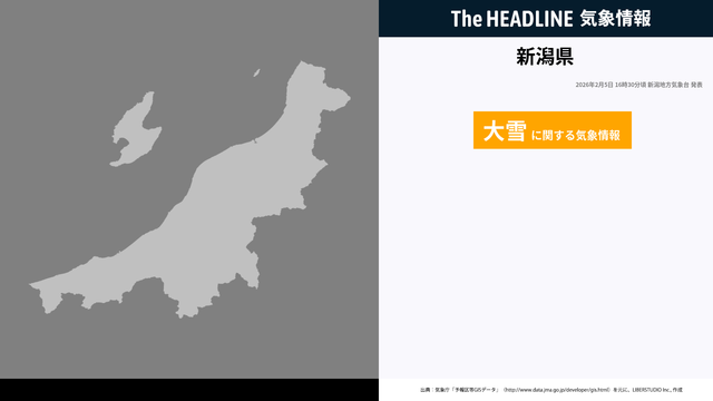 2月5日16時30分、新潟地方気象台は、新潟県に発表されている警報・注意報の経過、予測、防災上の留意点などを解説するために大雪に関する気象情報を発表した。