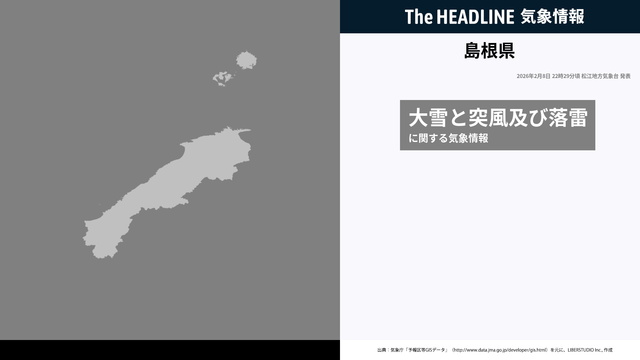 2月8日22時29分、松江地方気象台は、島根県に発表されている警報・注意報の経過、予測、防災上の留意点などを解説するために発表していた気象情報を更新した。