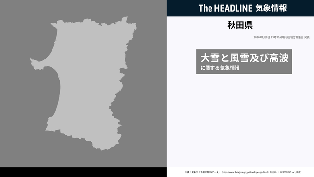 2月8日23時30分、秋田地方気象台は、秋田県に発表されている警報・注意報の経過、予測、防災上の留意点などを解説するために発表していた気象情報を更新した。