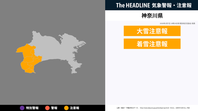 2月7日14時14分頃、神奈川県の大雪注意報・着雪注意報が更新
