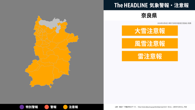 2月8日3時57分頃、奈良県に大雪注意報・風雪注意報などが発表