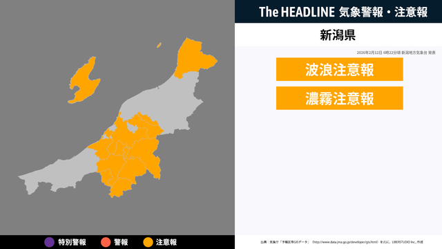 2月12日6時22分頃、新潟県に波浪注意報・濃霧注意報が発表