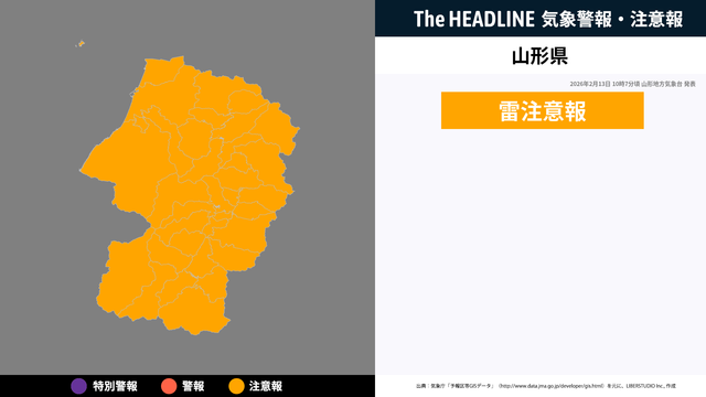2月13日10時7分、山形地方気象台より山形県に雷注意報が発表された。