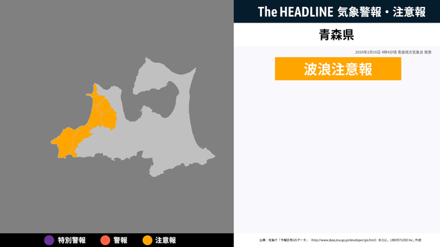 2月16日4時4分、青森地方気象台より青森県に波浪注意報が発表された。