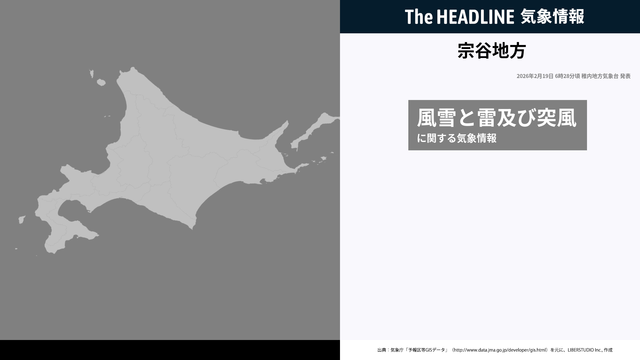 2月19日6時28分、稚内地方気象台は、宗谷地方に発表されている警報・注意報の経過、予測、防災上の留意点などを解説するために発表していた気象情報を更新した。