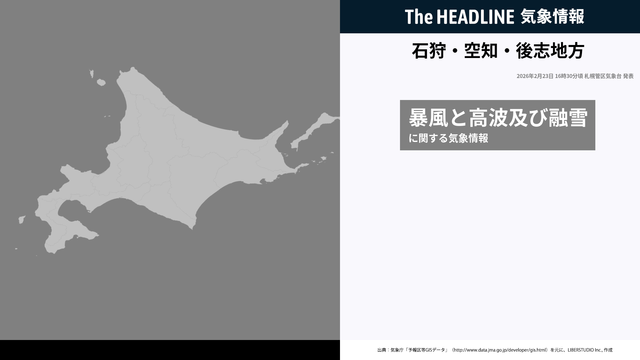 2月23日16時30分、札幌管区気象台は、石狩・空知・後志地方に発表されている警報・注意報の経過、予測、防災上の留意点などを解説するために発表していた気象情報を更新した。