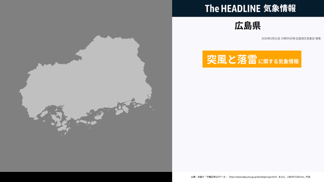 2月21日15時59分、広島地方気象台は、広島県に発表されている警報・注意報の経過、予測、防災上の留意点などを解説するために突風と落雷に関する気象情報を発表した。