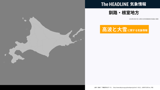 2月27日16時15分、釧路地方気象台は、釧路・根室地方に発表されている警報・注意報の経過、予測、防災上の留意点などを解説するために高波と大雪に関する気象情報を発表した。
