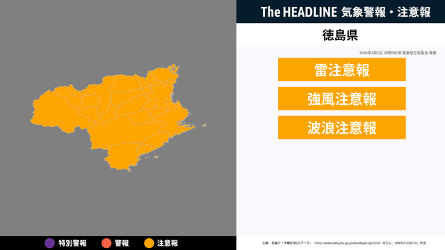 3月2日20時9分、徳島地方気象台より徳島県に雷注意報・強風注意報などが発表された。
