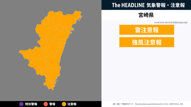 3月6日6時34分頃、宮崎県に雷注意報・強風注意報が発表
