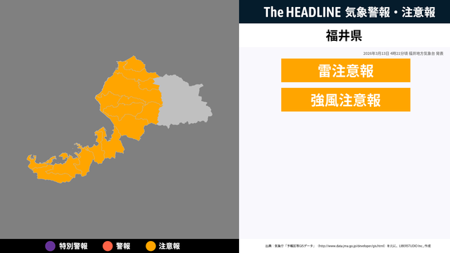 3月13日4時21分頃、福井県に雷注意報・強風注意報が発表