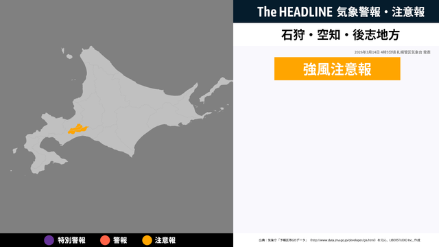 3月14日4時5分、札幌管区気象台より石狩地方に強風注意報が発表された。