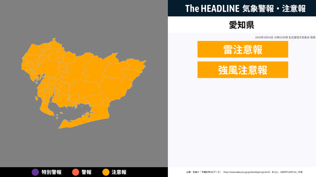 3月18日16時23分頃、愛知県に雷注意報・強風注意報が発表