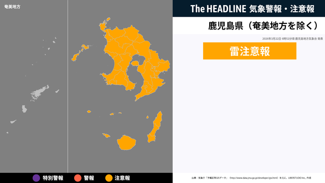 3月22日6時52分、鹿児島地方気象台より鹿児島県(奄美地方除く)に雷注意報が発表された。