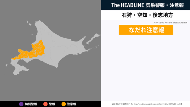 3月22日9時32分、札幌管区気象台より石狩地方・空知地方・後志地方になだれ注意報が発表された。