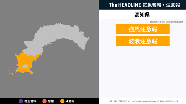 3月25日4時20分、高知地方気象台より高知県に強風注意報・波浪注意報が発表された。