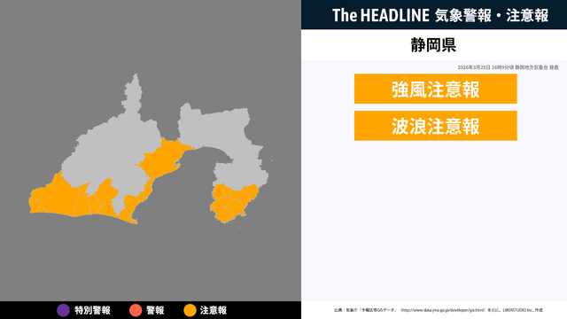 3月25日16時9分頃、静岡県に強風注意報・波浪注意報が発表