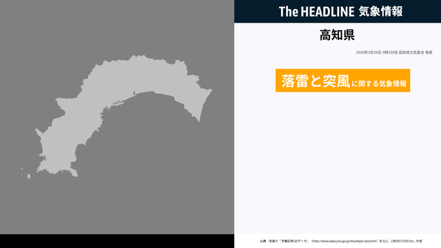 3月29日5時3分、高知地方気象台は、高知県に発表されている警報・注意報の経過、予測、防災上の留意点などを解説するために落雷と突風に関する気象情報を発表した。