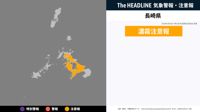 3月29日7時32分、長崎地方気象台より長崎県に濃霧注意報が発表された。