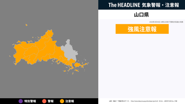 3月30日10時12分、下関地方気象台より山口県に強風注意報が発表された。