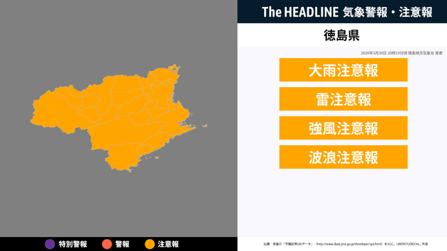 3月30日20時13分、徳島地方気象台より徳島県に大雨注意報・雷注意報などが発表された。
