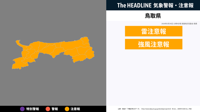 3月30日21時9分、鳥取地方気象台より鳥取県に雷注意報・強風注意報が発表された。