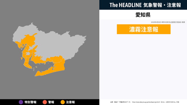 4月6日4時59分、名古屋地方気象台より愛知県に濃霧注意報が発表された。