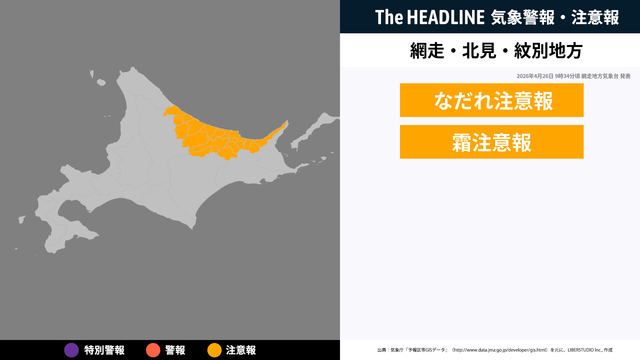 4月26日9時34分頃、網走・北見・紋別地方になだれ注意報・霜注意報が発表