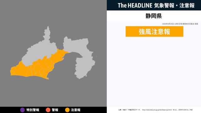 4月29日12時2分、静岡地方気象台より静岡県に強風注意報が発表された。