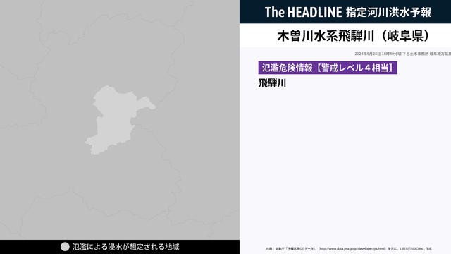 5月28日18時40分、下呂土木事務所と岐阜地方気象台は、木曽川水系飛騨川で氾濫危険水位に到達し、氾濫の恐れがあると発表した。