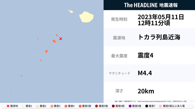 05月11日12時11分頃、トカラ列島近海を震源とするマグニチュード4.4の地震が観測された。最大震度4を観測したのは、鹿児島県。