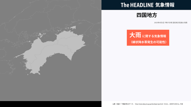 6月2日7時37分、高松地方気象台は、線状降水帯が発生して大雨災害の危険度が急激に高まる可能性を発表した。四国地方では、太平洋側では2日夜遅くにかけて土砂災害に厳重に警戒する必要がある。
