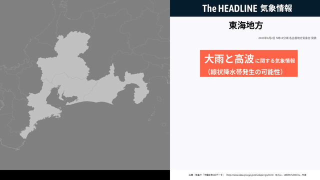 6月2日5時13分、名古屋地方気象台は、線状降水帯が発生して大雨災害の危険度が急激に高まる可能性を発表した。東海地方では、土砂災害、低い土地の浸水、河川の増水や氾濫に警戒し、うねりを伴った高波に注意・警戒する必要がある。