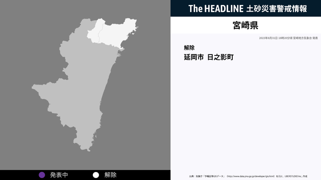 8月31日18時20分、土砂災害の危険性の高まりから宮崎地方気象台より宮崎県に発表されていた、土砂災害警戒情報が解除された。