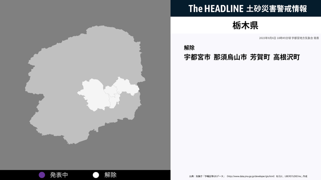 9月6日18時45分、土砂災害の危険性の高まりから宇都宮地方気象台より栃木県に発表されていた、土砂災害警戒情報が解除された。