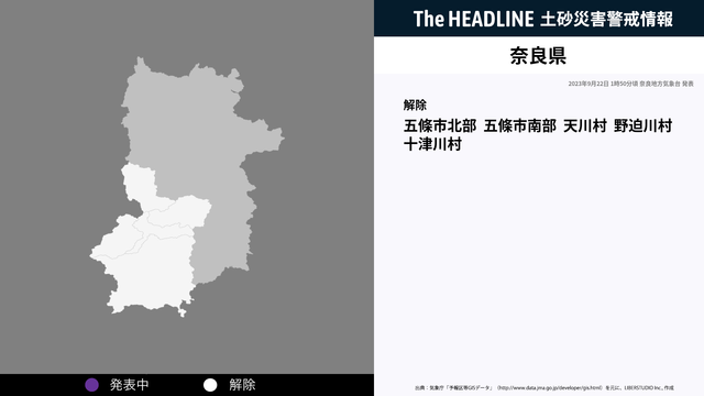 9月22日1時50分、土砂災害の危険性の高まりから奈良地方気象台より奈良県に発表されていた、土砂災害警戒情報が解除された。