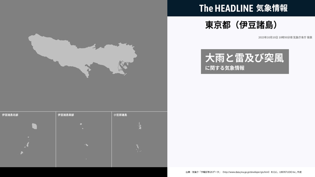 10月10日10時50分、気象庁本庁は、東京都(伊豆諸島)に発表されている警報・注意報の経過、予測、防災上の留意点などを解説するために発表していた気象情報を更新した。